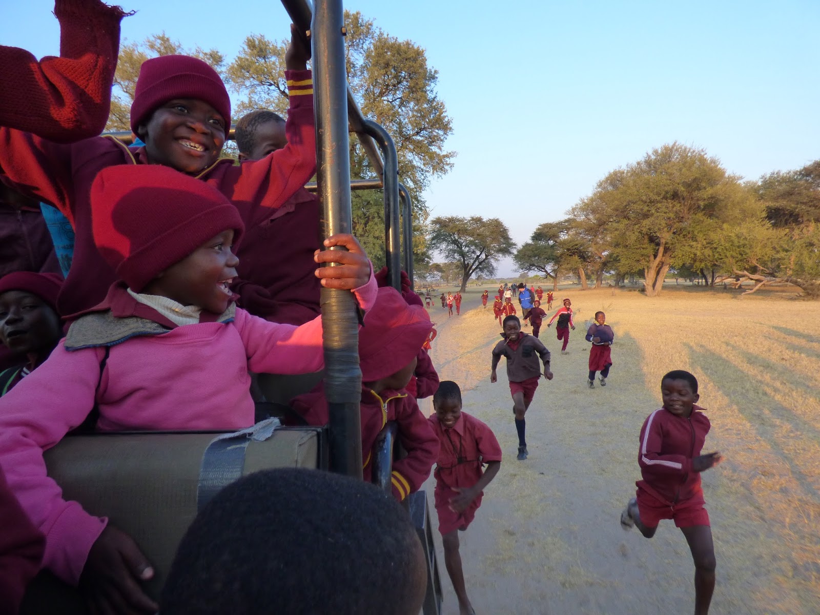 Butch is just as much about wildlife as he is about people and we learned that first hand the next morning when we arose at 6:00AM and set off to join the local school kids as they walked to school. It was a raucous scene as we were greeted by several hundred children cheering and we descended from the vehicles to literally start running with the kids shouting and laughing several kilometers to school. Our kids loved it and so did we!